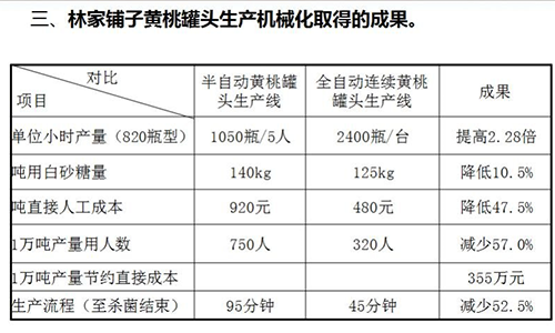 林家鋪?zhàn)狱S桃罐頭生產(chǎn)機(jī)械化取得的成果如下表(以下圖片由林家鋪?zhàn)?010年當(dāng)年采購使用后做的對照表):